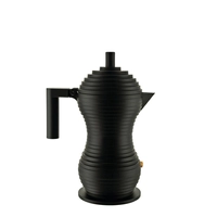 - Pulcina od Alessi, kawiarka espresso zaprojektowana przez Michele de Lucchi. Elegancka, czarna, aluminiowa konstrukcja z poliamidowym uchwytem. Innowacyjna technologia zaparzania eliminuje gorzką nutę, pojemność 150 ml.