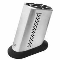 - Global G-835BD to blok na 10 noży, który wyróżnia się solidną konstrukcją z matowej stali nierdzewnej i antypoślizgową podstawą. Otwory z nylonowymi osłonami gwarantują ochronę ostrzy oraz łatwość w utrzymaniu higieny.