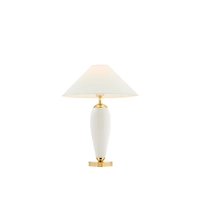 - Lampa stołowa Rea Gold w kolorze czarnym ze złotymi dodatkami i szklaną, czarną podstawą marki Kaspa. Wysokość lampy wynosi 60 cm, wykonana z metalu, szkła, oraz tkaniny.