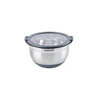 - Miska ze stali nierdzewnej o pojemności 1,5 litra to połączenie trwałości i funkcjonalności. Antypoślizgowe dno zapewnia stabilność, a przezroczysta pokrywka z silikonowym brzegiem ułatwia przechowywanie. Idealna do mieszania, serwowania i przechowywania.