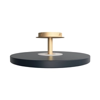 - Lampa Asteria Up w kolorze białym o średnicy 60 i wysokości 21 centymetrów z podsufitką w kolorze mosiądzu, duńskiej marki Umage wykonana ze szkła akrylowego, aluminium oraz stali, rozmiar large.
